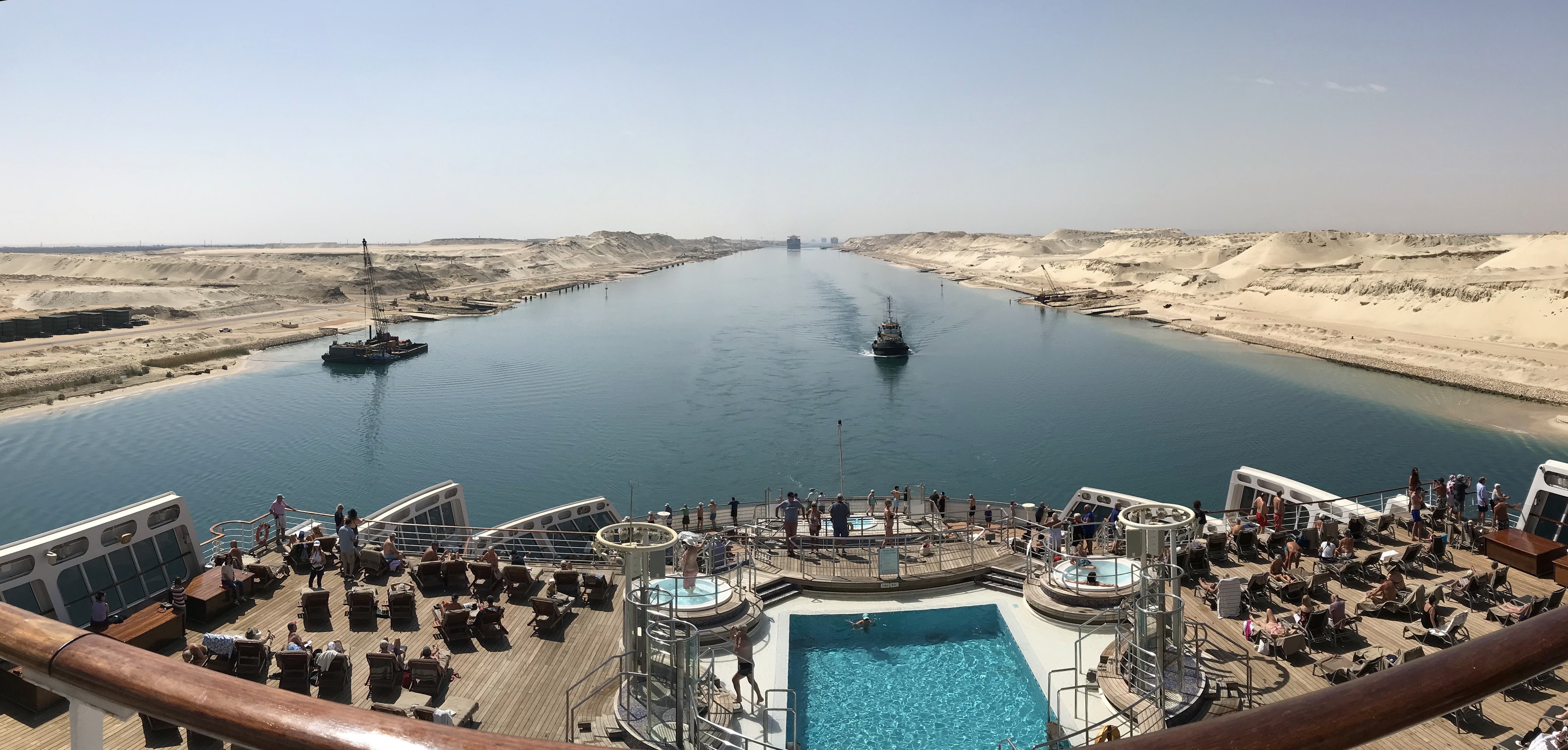 | On April 2, 2019 we entered the Suez canal on the way to the Mediterranean Sea. The canal is 106 miles long and took 16 hours. The canal was first opened in 1869. It was single passage until 2014 when a 2nd canal was dug and completed in 2015. |