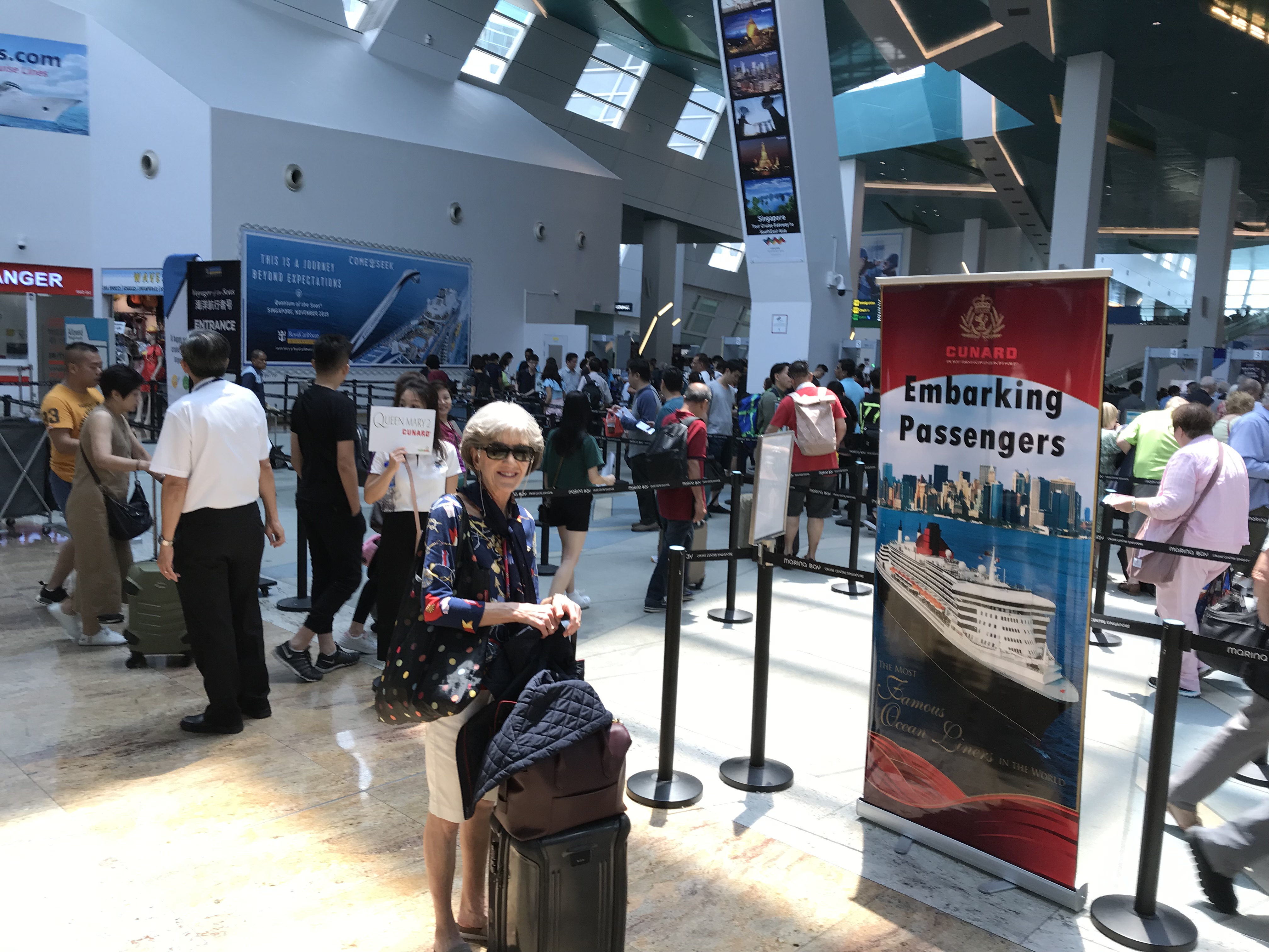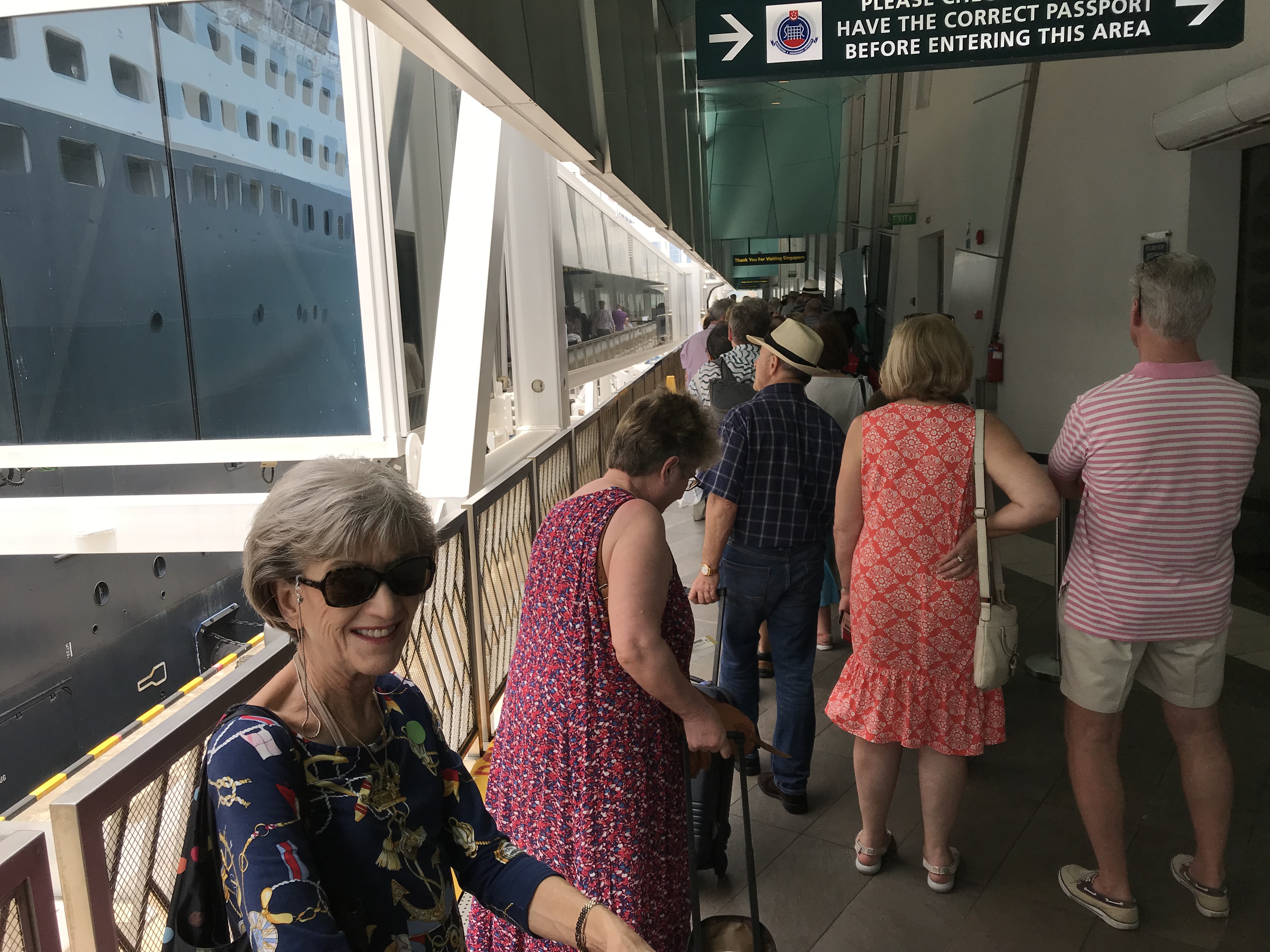 | Joanne gets in line to check into the Queen Mary 2 cruise to London. |