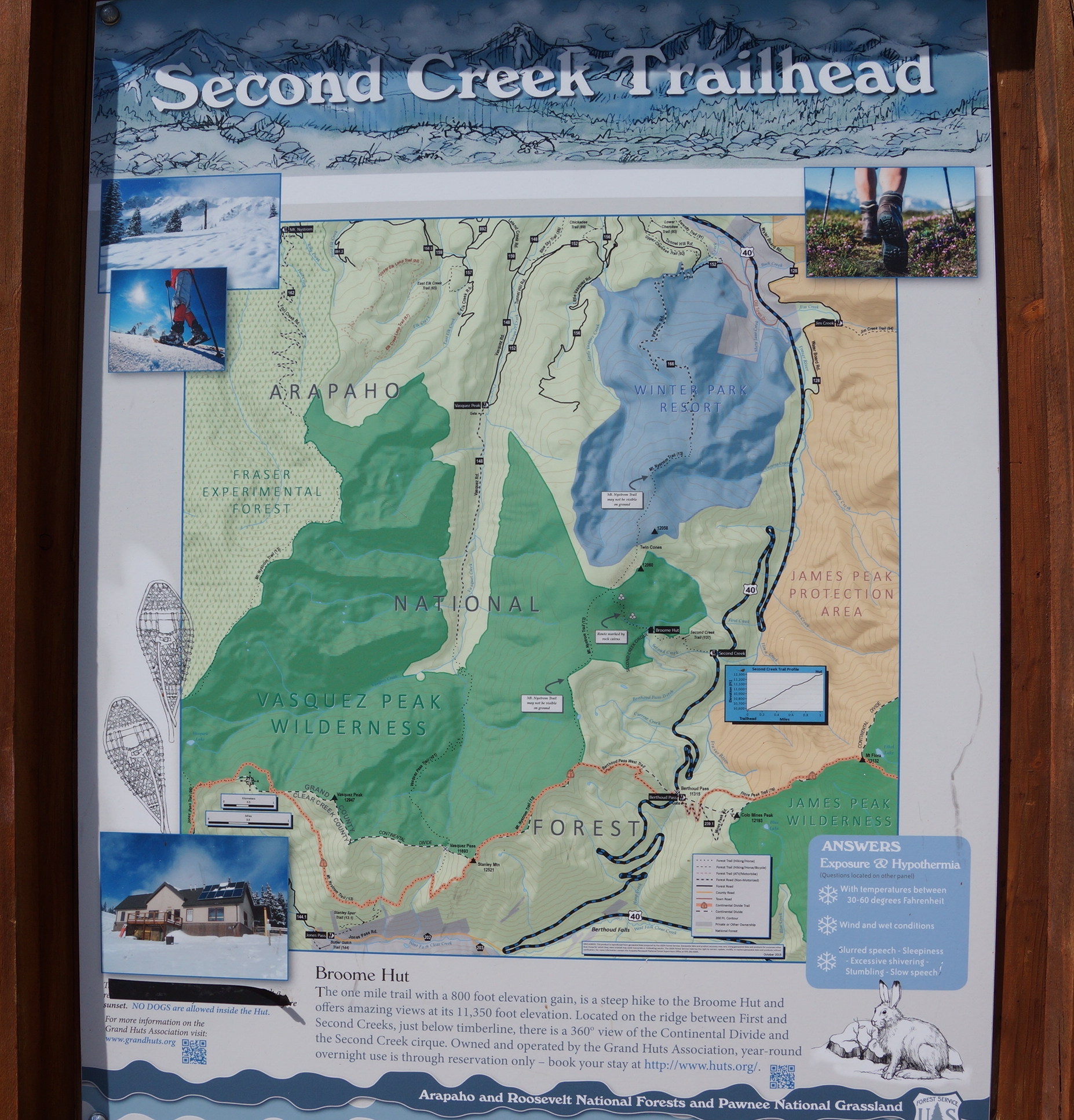 | The 2nd Creek hike trailhead is just north of Berthoud Pass along highway 40. The hut is part of the Winter Park Ski Resort. The trail goes to the Broome Hut. It is 1 mile to the hut from the trailhead. |